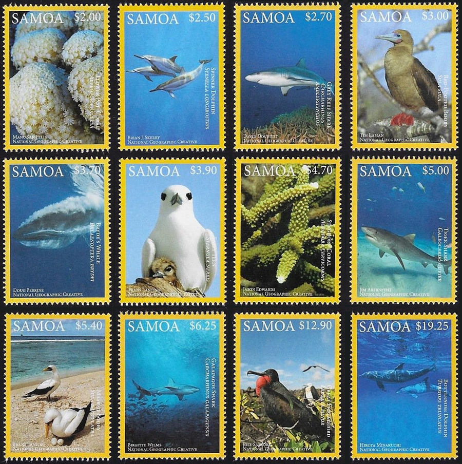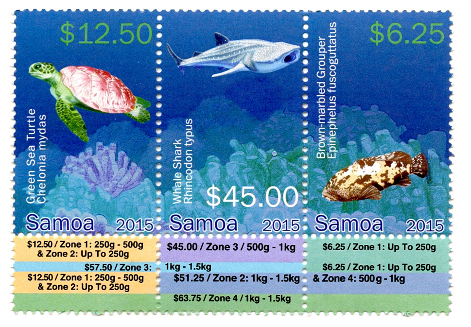 As might be expected one of the popular themes in this area is marine and animal life. Earlier this year, in March, Samoa completed its Threatened Species series with this set of three high value stamps, designed by Mariya Karchevskaya.
