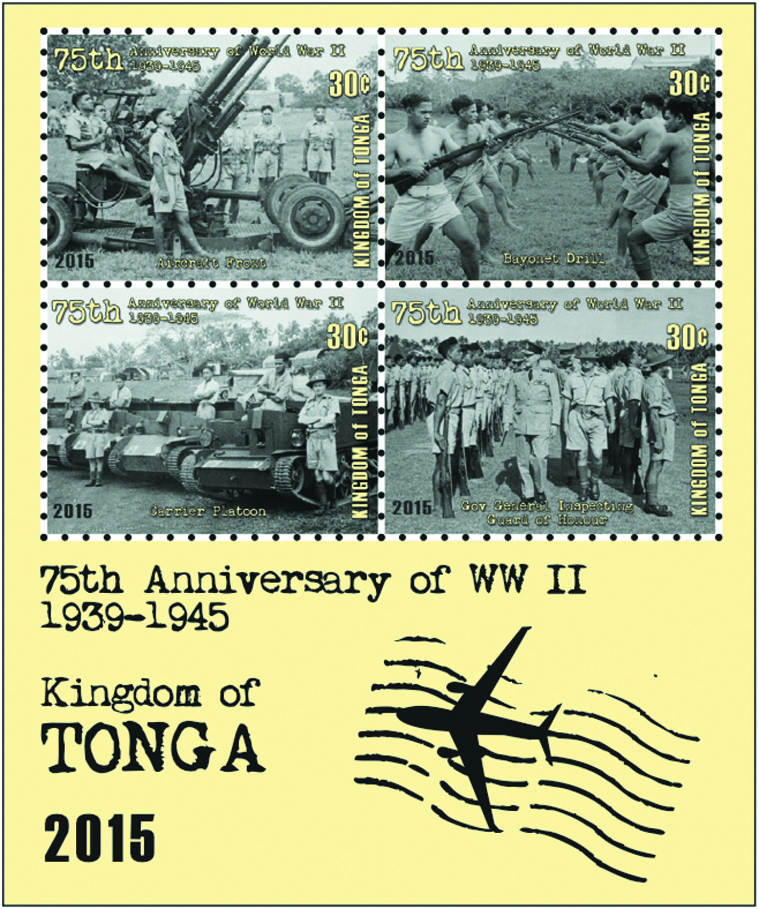 The WW I issue depicts the War Memorial that stands at Pangai Si`i, in Nuku`alofa (Tonga). The WW II issue utilizes archive photographs of soldiers during the various aspects of training in Tonga.