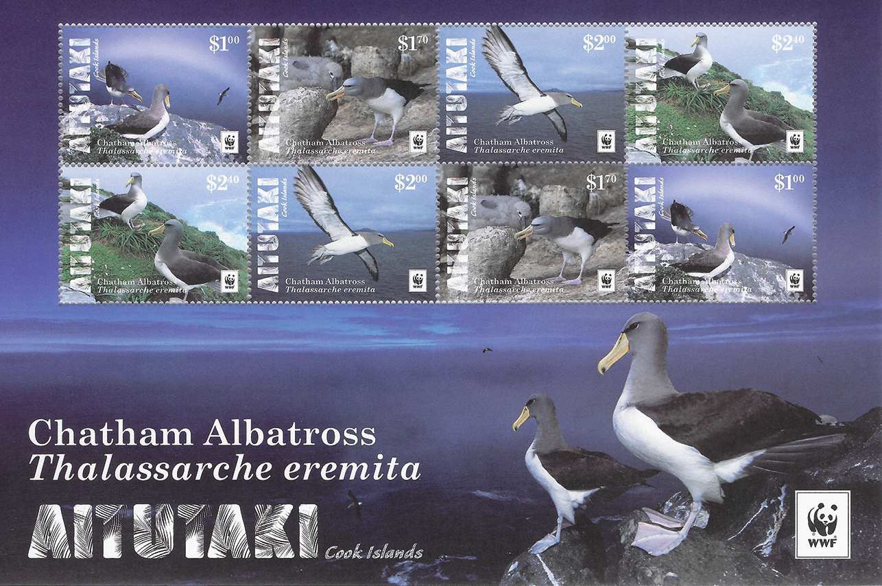 One outstanding example comes from Aitutaki, with a WWF sheetlet of eight stamps depicting the Chatham Albatross, which is classified as a . . .
