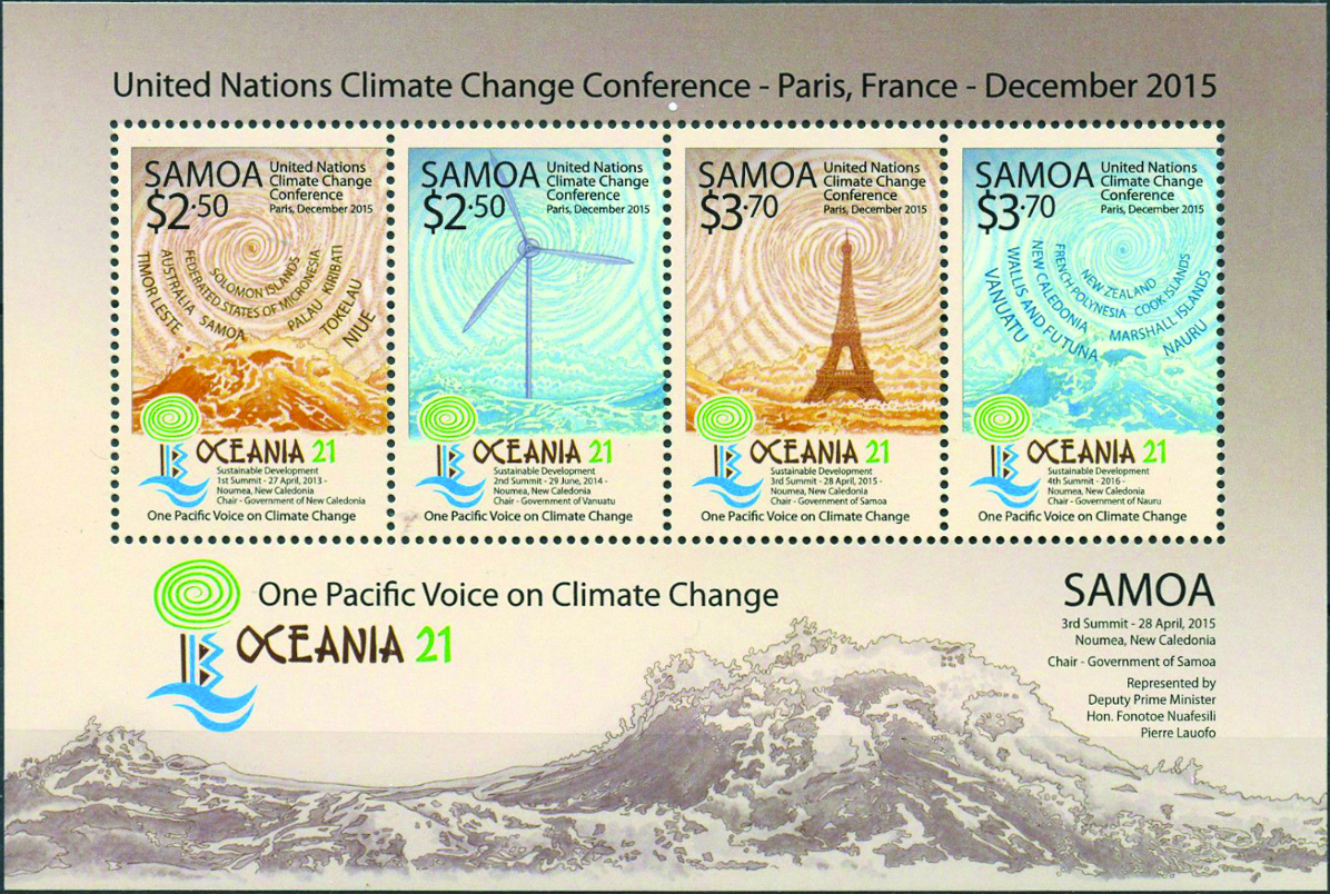 Last November 3 the Pacific Island nation of Samoa issued a set of four singles and a souvenir sheet using the same designs to commemorate the 2015 Oceania 21 climate control conference that was held April 28-30 in New Caledonia.