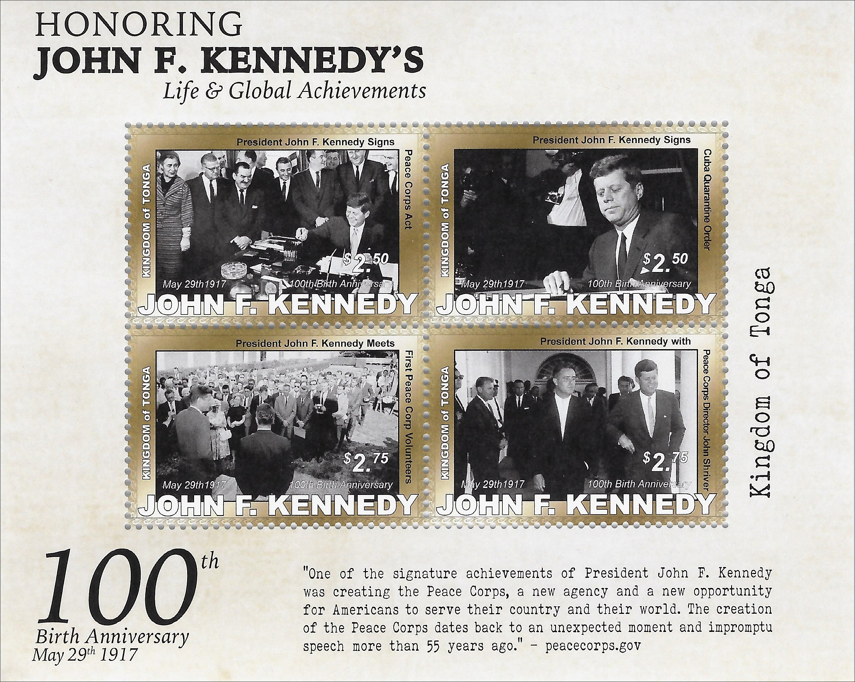 The Kingdom of Tonga stamps display photographs representing one of Kennedy’s well known achievements as President, the Peace Corps Act that has. . .