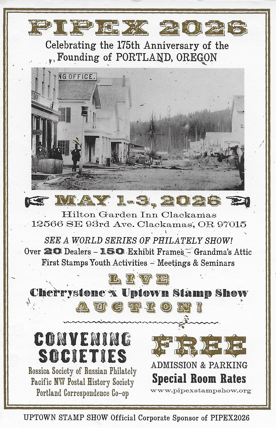 PIPEX 2026, Hinton Garden Inn, 12566 SE 93rd Ave. Annual convention of the Northwest Federation of Stamp Clubs, with exhibits, dealers, auction, meetings and more. Fri & Sat, 10-6; Sun, 10-4. Free.