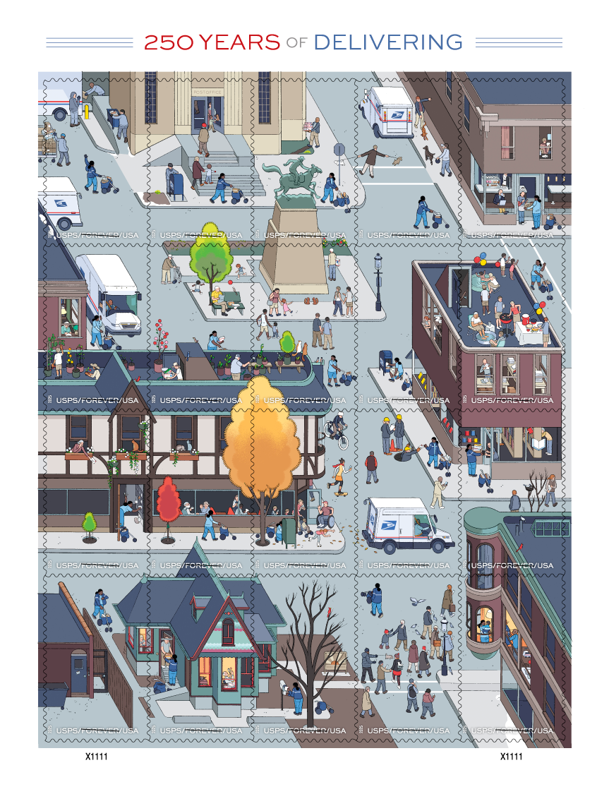 250 Years of Delivering With this issue, the Postal People celebrate 250 years of operation, from the many years as the Post Office Department starting on July 26, 1775, and since July 1, 1971 as the United States Postal Service. The pane of 20 stamps by cartoonist Chris Ware invites the public to spot a fun array of familiar postal items and icons while following a mail carrier on her rounds through four seasons of the year. From top to bottom on the pane, the horizontal strips go from Spring through Summer, Fall and then Winter. The liner, or backing, of the “Delivering” pane describes the journey of the carrier, along with ‘treasure hunt’ images on the pane.