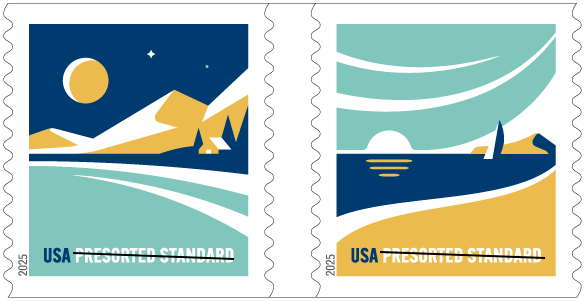 American Vistas Non-Denominated Presorted Standard Rate (10¢) These two stamps depicting stylized, minimalist scenes of mountains and a beach are for use on business mail. Mail with stamps affixed is thought to more likely be opened than mail with printed indicia. In similar fashion, the goal is to create designs that will not offend mail recipients; thus the “minimalist” designs. The stamps feature screen prints by DKNG Studios made from vector illustrations, and were designed by Greg Breeding, an art director for USPS. |