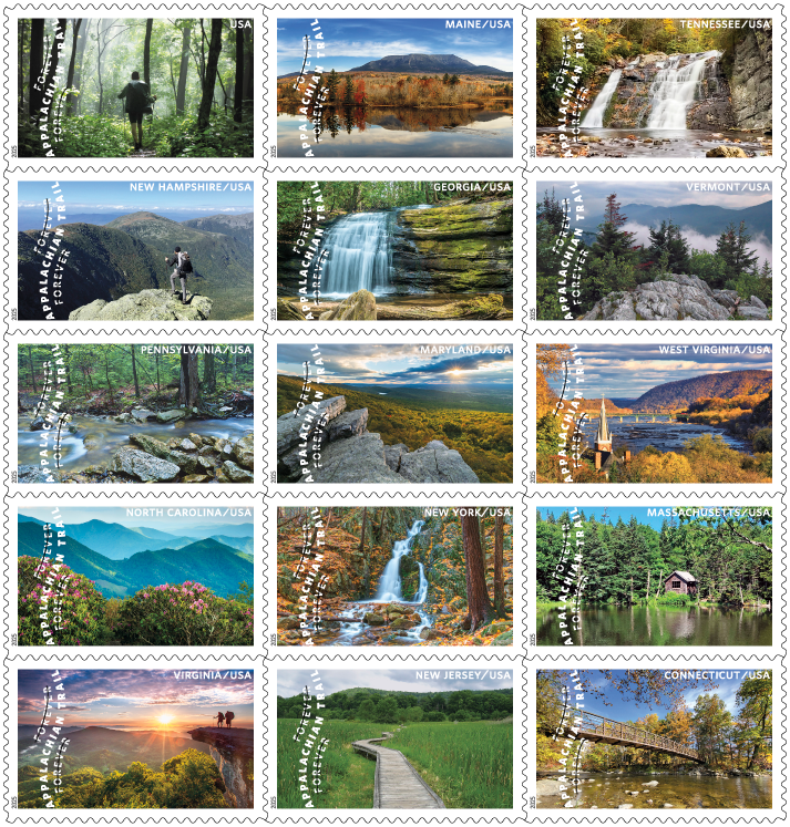 The Appalachian Trail Forever Stamps Covering almost 2,200 miles of footpath along one of Earth’s most ancient mountain ranges, the century-old Appalachian National Scenic Trail is within easy reach of large metropolitan areas of the East Coast. The Appalachian Trail is maintained by a network of volunteer clubs, led by the nonprofit Appalachian Trail Conservancy. This pane of 15 stamps includes a photographic view from each of the 14 states along the Maine-to-Georgia trail with an additional stamp showing stretches of trail through dense forest. Antonio Alcalá, an art director for USPS, designed the stamps with images from various photographers. |
