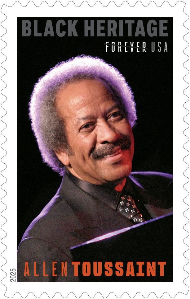 Black Heritage: Allen Toussaint Forever Stamp he 48th stamp in the Black Heritage series celebrates this virtuoso pianist, singer, songwriter, composer, arranger, and producer responsible for scores of hits across multiple genres. New Orleanian Allen Toussaint may have done more than anyone else to shape the special blend of rhythm and blues for which the city is beloved, and to put it out to the wider world. Designed by Ethel Kessler, an art director for USPS, the stamp features a photograph taken by Bill Tompkins in New York City in 2007. Per the USPS 2025 launch announcement, “In recent years, the Black Heritage series has celebrated a man one year and a woman the next,” which raises the question: Might we be getting a woman honoree later this year . . . and two honorees every year? |
