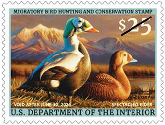 $25 Wildlife Service Hunting Permit “Duck” Stamp Duck stamps are not postage stamps. The Fish and Wildlife Service produces the Federal Duck Stamp, which sells for $25. Waterfowl hunters age 16 and older are required to purchase and carry the current Federal Duck Stamp. Many non-hunters, including birdwatchers, conservationists, stamp collectors and others, also purchase the stamp in support of habitat conservation. Additionally, a current Federal Duck Stamp can be used for free admission to any national wildlife refuge that charges an entry fee. Since 1934, sales of this stamp have raised more than $1.2 billion to protect over Duck stamp designs are the result of an annual design competition, and are particularly popular with stamp collectors, as a result of their colorful designs. South Dakota artist Adam Grimm was the winner of the Federal Duck Stamp Art Contest for the 2025 issue, with a painting of a pair of Spectacled Eiders. |