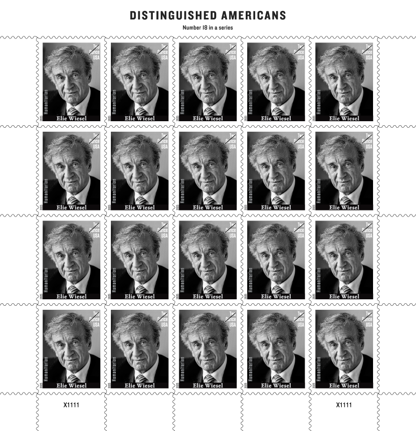 Elie Wiesel Great Americans Series Forever 2 Ounce Rate Humanitarian Elie (1928-2016), was a survivor of Nazi concentration camps whose dozens of works bore witness to the Holocaust and whose resilience and compassion continue to be a source of inspiration. Instead of bearing a specific denomination, this issue is a Forever issue for 2-ounce mail. The design is based on a 1999 black-and-white photograph of Wiesel by Sergey Bermeniev. Ethel Kessler, an art director for USPS, designed the stamp. |