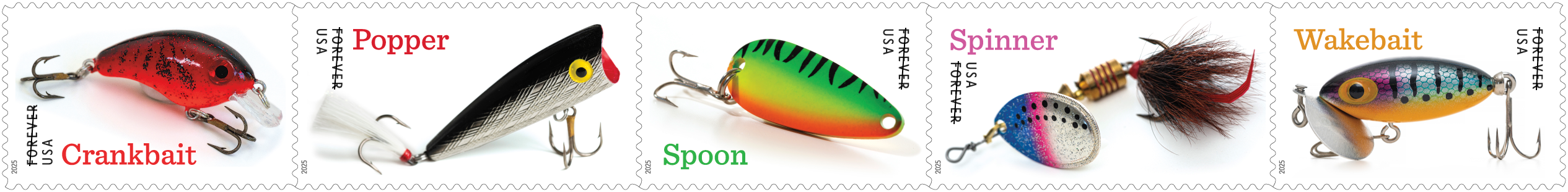 Freshwater Fishing Lures Forever Stamps Recreational fishing attracts more than 55 million anglers to America’s lakes, rivers, and oceans each year–and lure designs for different environments are part of its growing appeal. These stamps using photos by Sarah Cramer Shields show five lures considered icons of the sport. A 1991 set featured five Fishing Flies. |