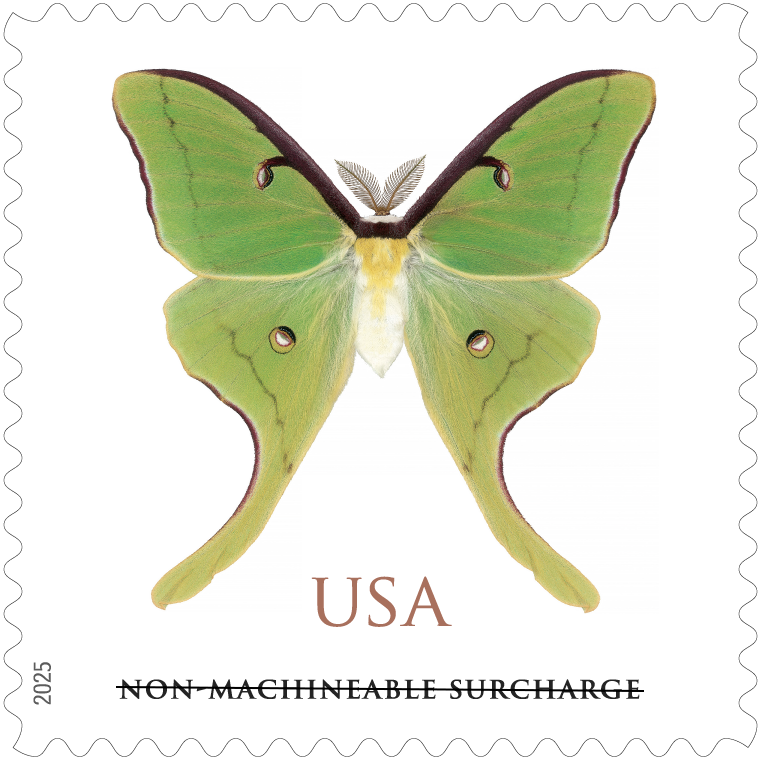 Luna Moth (Non-machineable Surcharge) This new stamp for irregularly sized envelopes features a luna moth (Actias luna), considered one of the most beautiful moths in the United States. Artist Joseph Scheer created this composite image by using a high-resolution scanner with extended focus to capture multiple layers of a preserved moth. Derry Noyes, an art director for USPS, designed the stamp. |