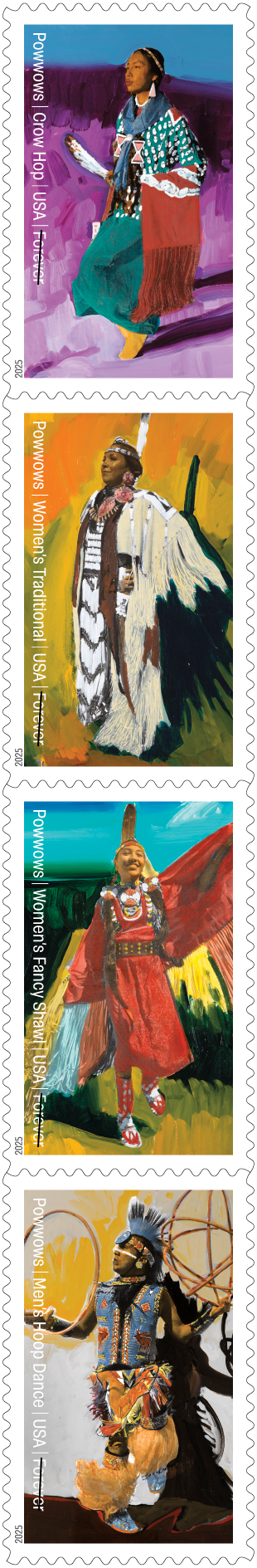 The Postal Service strives to tell the stories of all Americans on its stamps, and issuing stamps that honor the living culture and heritage of Indigenous people is an important part of that goal. These stamps celebrate Powwows, Native American social and ceremonial gatherings that feature music, dance and festive regalia. For this issuance, Cochiti Pueblo artist Mateo Romero created original paintings of four powwow dancers performing their craft against brightly colored backgrounds that highlight each dancer’s movement and traditional dress. In 1996 the USPS issued an “American Indian Dances” sheetlet of five dancers in action.