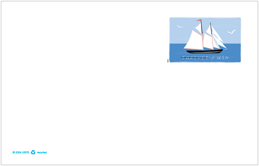 Schooner (Forever Stamped Card) New stamped-card designs are issued every few years for customers who want to send postcards with postage already included. The latest features an illustration of a two-masted sea vessel based on a photo of a 2014 replica of the 1923 schooner Columbia. Libby VanderPloeg was the artist and Antonio Alcalá provided art direction. |