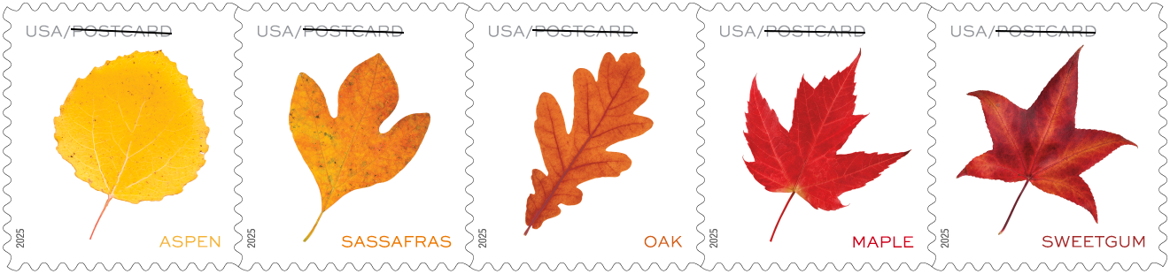 Evoking the colorful sights of a seasonal walk in the woods, the photographs on five new postcard stamps depict leaves on trees found in the United States. Antonio Alcalá, an art director for USPS, designed the stamps. |