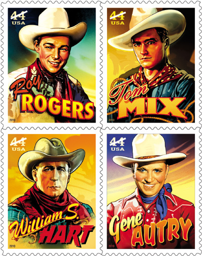 Apr. 17, 4446-4449–44¢ Cowboys of the Silver Screen pane of 20: William S. Hart, Tom Mix, Gene Autry, Roy Rogers. Oklahoma City, OK 73125. FDCs to Cowboys of the Silver Screen Stamp, Postmaster, 4025 West Reno Ave., Oklahoma City, OK 73125-9998. FDC deadline June 17. | |