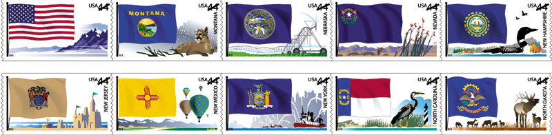 Apr. 16–44¢ Flags of Our Nation Set 4 coil of 50: Montana, Nebraska, Nevada, New Hampshire, New Jersey, New Mexico, New York, North Carolina, North Dakota and U.S. flag design “Purple Mountain Majesties” (from “God Bless America”). FDCs to Flags of Our Nation Stamp Set 4, Postmaster, 421 Eighth Ave., Rm. 2029B, New York, NY 10199-9998. FDC deadline June 16. (Apr. 9, p. 10) | |