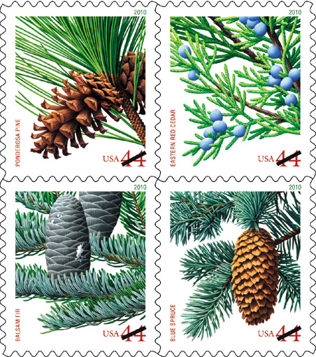 Oct. 21–44¢ Holiday Evergreens: Ponderosa Pine, Easter Red Cedar, Balsam Fir and Blue Spruce, booklet of 20, ATM booklet of 18, New York, NY 10199 (Mega Event) | |
