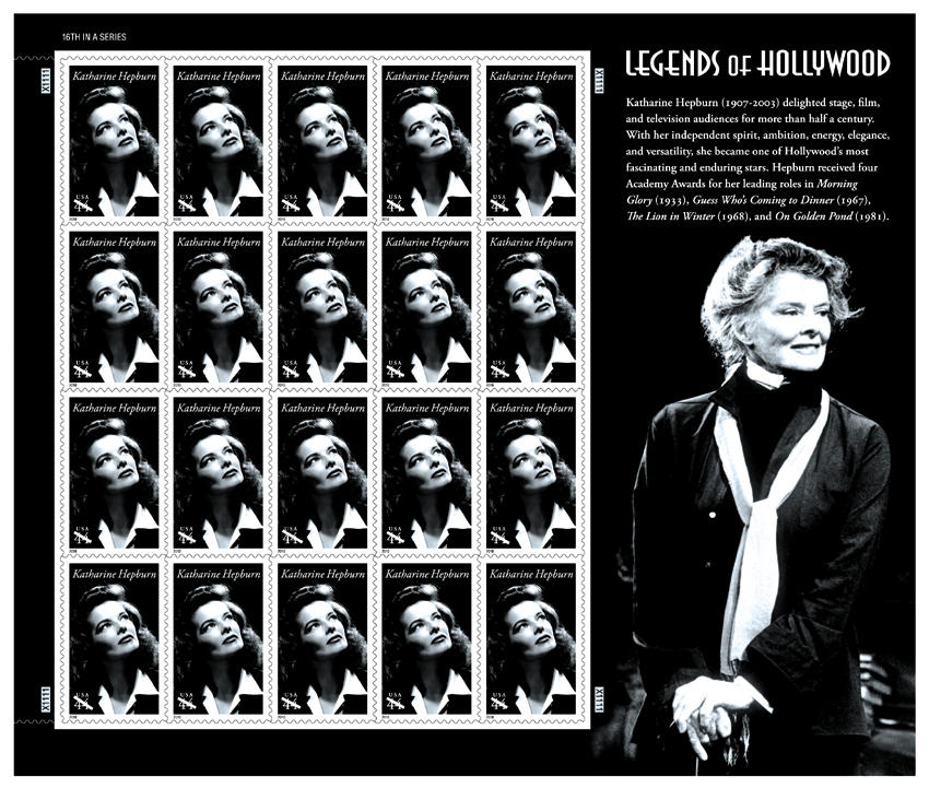 May 12–44¢ Legends of Hollywood: Katharine Hepburn pane of 20, Old Saybrook, CT 06475. FDCs to Katharine Hepburn Stamp, Postmaster, 36 Main Street, Old Saybrook, CT 06475-9998. FDC deadline July 12. (May 7, p. 12) | |
