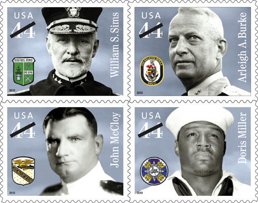 Feb. 4, Sc. 4440-43–44¢ Distinguished Sailors Distinguished Sailors, in Sc. # order: Admiral William S. Sims, Admiral Arleigh A. Burke, Lt. Commander John McCloy, Petty Officer 3rd Class Doris Miller pane of 20; block or horiz. strip of 4, Sc. 4443a. Washington, DC 20090. (Dec. 4, 2009, p. 10) | |