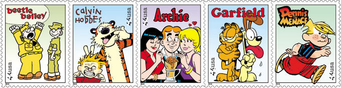 July 16–44¢ Sunday Funnies: Dennis the Menace, Calvin and Hobbes, Archie, with Betty and Veronica, Garfield the cat with dog Odie, Beetle Bailey, and Sarge, pane of 20, Columbus, OH 43216. | |