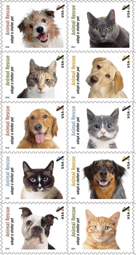 Apr. 30, Sc. 4451-4460–44¢ Animal Rescue “Adopt a Shelter Pet” Social Awareness set, five diff. cats and five diff. dogs, pane of 20. FDCs to Animal Rescue: Adopt a Shelter Pet Stamps, c/o Postmaster, 7035 Laurel Canyon Blvd., Hollywood, CA 91605-9998. FDC deadline June 30. (Apr. 23, p. 10) | |