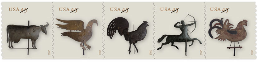 Weather Vanes [Click to see 5 designs] The Weather Vanes coil stamps picture five weather vanes that were made in the United States during the 19th century. Unlike most new U.S. issues, they will be denominated in the First Class Letter Mail rate instead of as Forever issues. Before 1850, most American weather vanes were created by individual craftsmen. During the second half of the 19th century—in what collectors consider the “golden age” of American weather vanes—factories around Boston and New York City began mass-producing weather vanes. The five weather vanes, reproducing a cow, and eagle, a centaur and two roosters, all are part of the collection of the Shelburne Museum in Shelburne, Vermont. |