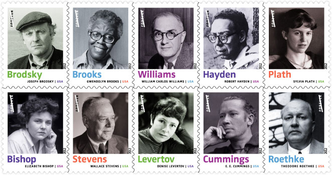 Twentieth-Century Poets [Click to see 10 designs] The ten great Twentieth-Century Poets on these Forever stamps honor Elizabeth Bishop, Joseph Brodsky, Gwendolyn Brooks, E. E. Cummings, Robert Hayden, Denise Levertov, Sylvia Plath, Theodore Roethke, Wallace Stevens and William Carlos Williams—a group that include winners of numerous Pulitzer Prizes, National Book Awards, and honorary degrees. The reverse of the pane of 20 stamps includes an excerpt from one poem by each of the ten poets. Most of the honorees are American born, one exception being Joseph Brodsky, an exile from the Soviet Union who became the first foreign-born poet to be appointed Poet Laureate of the United States. |
