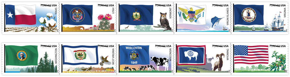 Flags of our Nation [Click to see 10 designs] This series has reached the end of the alphabet, with the states of Texas, Utah, Vermont, Virgin Islands, Virginia, Washington, West Virginia, Wisconsin, Wyoming and another U.S. flag. The format once again is two strips of five stamps in coils. |