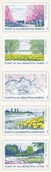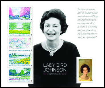 Lady Bird Johnson [Click to see 5 designs, Click to see sheet] This souvenir sheet with five Forever stamps honors the former First Lady, wife of Lyndon B. Johnson, and her Beautification efforts. One stamp reproduces her official White House portrait and the other five are adaptations of 1960s stamps, Scott 1318 and 1365-68. U.S.P.S. to Honor Lady Bird Johnson Article, |