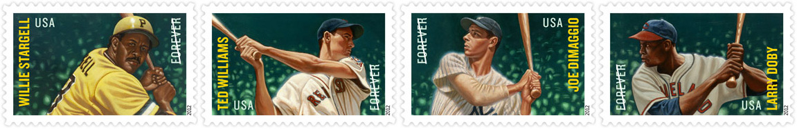 Major League Baseball All-Stars [Click to see 4 designs] The four subjects are Joe DiMaggio, Ted Williams, Larry Doby (first Black player in the American League) and Willie Stargell. Here’s one issue where the first day date and city have already been decided. They will be introduced at the Baseball Hall of Fame in Cooperstown during the annual induction ceremonies. |