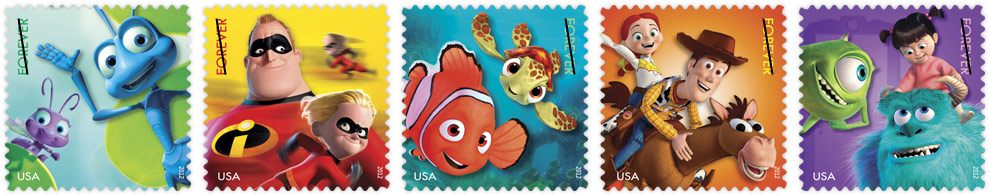 Mail a Smile [Click for 5 designs] Another collaboration with the Disney Studios’ Pixar series of motion pictures, following this year’s “Send Hello” set. The designs show characters from A Bug’s Life (1998), Toy Story 2 (1999), Monsters, Inc. (2001), Finding Nemo (2003) and The Incredibles (2004). The stamps will be issued August 19 at the Disney convention |