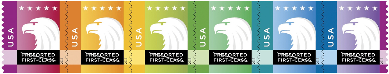 Spectrum Eagle [Click to see the full Spectrum] The new “Spectrum Eagle” Presorted First-Class Mail non-denominated stamp comes in six color varieties. The eagle’s profile is depicted in white, set against a sequence of six varying shades of reds, yellows, greens, and blues. Each color blends with the one following, resulting in a gradual spectrum from left to right across the six stamps. The stamps are used by bulk mailers because mail with a postage stamp on the envelope has a better chance of being opened than mail with a printed indicia. The issue was designed by Ethel Kessler, who also was the Art Director and Typographer. |