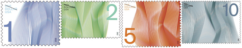 Waves [Click to see 4 designs] These $1, $2, $5 and $10 stamps are described by the USPS as “four sheets of elegant stamps… Designed as a customer convenience and to lend a contemporary appearance to packages, large envelopes, and other mailings.… “Each stamp shows variously colored undulating lines against a white background. A portion of one side of each stamp provides white space to display the numeral. The stamp also includes its denomination written out. In order to suggest its status as a high denomination issue, the stamps benefit from a highly detailed printing process that creates dense, abstract patterns similar to an engraved bank currency.… As the denominations increase, the stamp sizes grow larger.” (We illustrate them all at approximately the same size here.) |