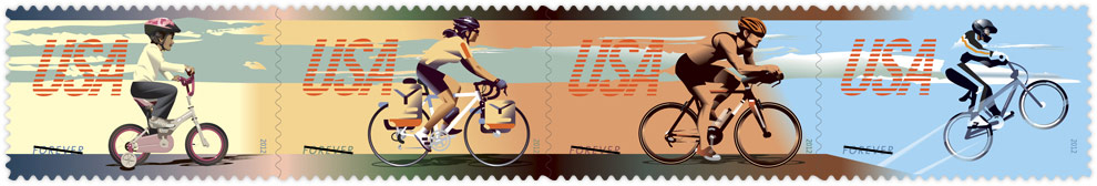 Bicycling [Click to see 4 designs] Another strip of four: a young child just learning to ride with training wheels; a commuter pedaling to work; a road racer; and an airborne BMX rider. |