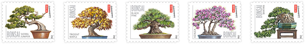Bonsai [Click to see 5 designs] This set of five stamps pictures bonsai plants. Bonsai is Japanese for “plant in a pot,” but the plants are typically trees that have been trained or miniaturized, and can live for decades. |