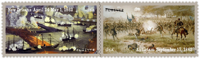 Civil War. “1862: A Nation Touched with Fire” [Click to see 2 designs] The second set in this annual series highlights the Battle of New Orleans, which lasted from April 24 to May 1, 1862, and the Battle of Antietam on September 17, 1862. The Battle of New Orleans stamp is based on a reproduction of an 1862 Currier and Ives colored lithograph titled The Splendid Naval Triumph on the Mississippi, April 24th, 1862. The Battle of Antietam use a reproduction of an 1887 painting that was part of a series produced in the 1880s to commemorate the Civil War. The souvenir sheet containing one each of the stamps also has a background illustration from a Currier and Ives print. |