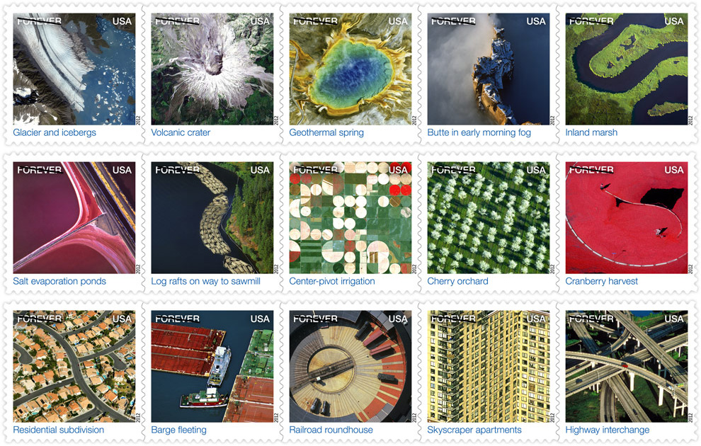 Earthscapes [Click to see 15 designs] Fifteen different views based on aerial or satellite photographs of a wide variety of scenes all across the country. There are five stamps in three groups: Natural: Glacier and Icebergs, Volcanic Crater, Geothermal Spring, Butte in Early Morning Fog, Inland Marsh; Agricultural: Salt Evaporation Ponds, Long Rafts on Way to Sawmill, Center Pivot Irrigation, Cherry Orchard, Cranberry Harvest; and Urban: Residential Subdivision, Barge Fleeting, Railroad Roundhouse, Skyscraper Apartments, and Highway Interchange. Click here to learn about the Mysterious Earthscapes Invert! |