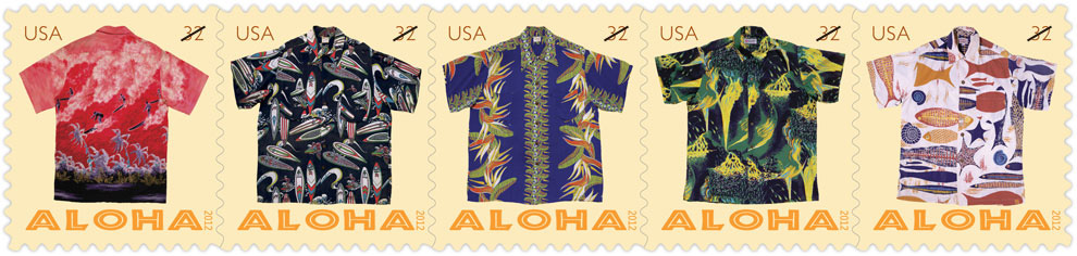 Aloha Shirts [Click to see 5 designs] The Aloha Shirts stamps that were issued January 19 in pressure sensitive adhesive (PSA) panes of 20 and PSA coils of 100 will be issued in a new format, PSA booklets of 10, at the National Philatelic Exhibition in McLean, Va. |