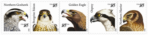 Birds of Prey [Click to see 5 designs] The five birds of prey on these stamps are the northern goshawk, peregrine falcon, golden eagle, osprey, and northern harrier. Birds of prey, also known as raptors, thrive in diverse habitats and live on every continent except Antarctica. The roughly 500 species of birds of prey, also known as raptors, include birds that hunt by day, such as falcons, eagles, and harriers, and birds that hunt by night — the owls. They are carnivorous, use their powerful talons to capture prey, and their exceptionally keen eyesight allows them to see small objects in detail, even from a great distance. The 85¢ Birds of Prey stamps pay the First Class three-ounce rate. |