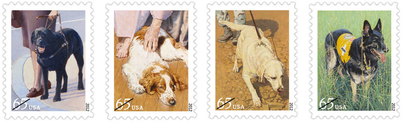 Dogs at Work [Click to see 4 designs] While the earliest dogs helped human hunters bring home prey, today’s dogs excel at a variety of jobs. The U.S. Postal Service celebrates the enduring partnership between dogs and people with this set of four stamps, which depict four hard-working canines: a guide dog assisting a woman who is blind, a tracking dog on the trail of a scent, a therapy dog visiting an elderly woman in her home, and a search and rescue dog standing in a field, ready to tackle the next assignment. The 65¢ stamps pay the First Class two-ounce rate. |
