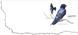 Purple Martin Stamped Envelope Two purple martins—the largest swallow in North America—are seen on the Purple Martin Stamped Envelope. In the eastern U.S., purple martins live almost exclusively in backyard birdhouses. Native Americans were the first to build houses for these acrobatic fliers, hanging up hollow gourds for them to nest in. Purple martins make excellent neighbors, as they devour many insects that people find annoying, such as flies, wasps, and stink bugs. This is a Forever stamped envelope, so the value of the postage is always equal to the value of the current First-Class Mail one-ounce rate. |
