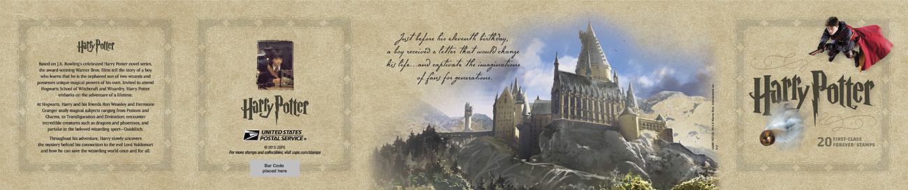 Harry Potter Stamp Collection [Click here for Harry Potter front cover] The Harry Potter set of 20 stamps was issued at Universal Orlando Resort's Wizarding World of Harry Potter. Folded out, the booklet cover presents an illustration of Hogwarts castle. Inside are five groupings of four stamps. Each grouping is set on its own page and each set of four stamps surrounds the red wax seal of Hogwarts School of Witchcraft and Wizardry. The stamps feature scenes from Warner Bros.' Harry Potter films, which brought author J.K. Rowling's magical world to the screen and gave physical shape to the characters, creatures and places that had lived in readers' imaginations since publication of the first book. Described as a Limited Edition, demand is expected to be strong, so a total of 5 million booklets were issued. |