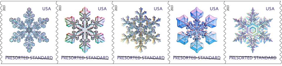 Snowflakes Presort Standard Rate Holiday Stamps [Click to see 4 designs] One of the new entries in the annual USPS Holiday issues rollout is a set of five different Presorted Standard rate Snowflake stamps. Each snowflake is set against a background of colors that fade from white at the bottom to icy blues and purples at the tops. The designs are reminiscent of the 2005 Snowflakes Holiday First Class stamps. Presort Standard Rate stamps are intended for use by volume mailers who have found that mail with a postage stamp affixed instead of a printed indicia has a better chance of being opened by the recipient. |