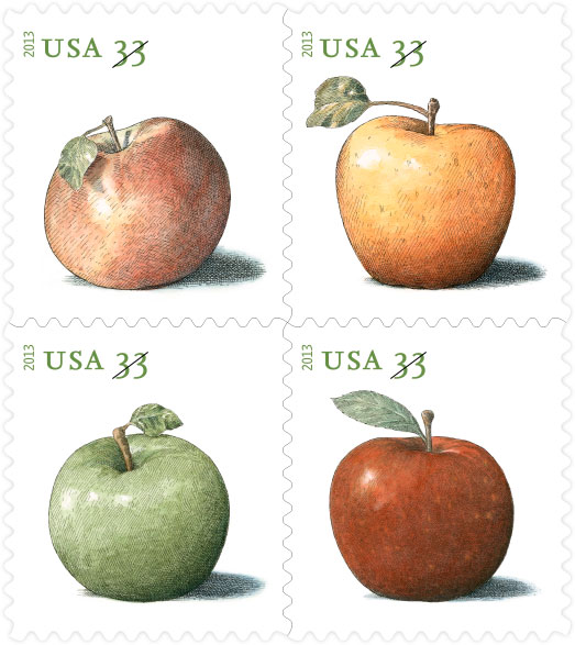 Apples [Click to see 4 designs] To meet the new 33¢ Postcard rate, the U.S. Postal Service turns to apples, described by the Postal People as “not only good—and good for you—but they're also delightful, cheery stamp subjects, just right for postcards!” Some of America's favorite varieties of this popular fruit are shown in these four stamps: the bright-red Baldwin, the green Granny Smith, the yellow Golden Delicious, and the multi-colored Northern Spy. Juicy and aromatic Baldwin apples are delicious when eaten in season—fresh, cooked, or in baked goods—and are prized by makers of cider. “Spies are for pies!” is a reminder that generations of cooks have found the Northern Spy apple delicious when baked in desserts, cider and juice—and today scientists believe this apple, loaded with vitamin C and antioxidants, may be one of the best at keeping the doctor away. The Golden Delicious apple, named for its yellow-gold skin and sweet flavor, is an excellent all-round apple, makes a purée good for use in baby foods and is said to make the best apple butter! The tart, green Granny Smith apple is one of the world's most well-known varieties. Its pleasingly sour flavor and crisp texture makes this juicy apple good for cooking or eating fresh. |