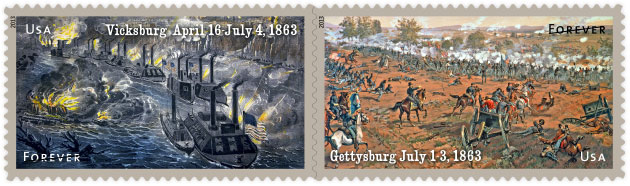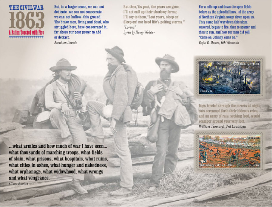 Civil War. 1863 [Click to see 2 stamp designs], [Souvenir Sheet] The third set in this annual series highlights the Battle of Gettysburg, the largest battle of the war, while the other depicts the Battle of Vicksburg, a complex Union campaign to gain control of the Mississippi River. The Battle of Gettysburg stamp is a reproduction of an 1887 chromolithograph by Thure de Thulstrup (1848-1930), a Swedish-born artist who became an illustrator for Harper's Weekly after the Civil War. Thulstrup's work was one of a series of popular prints commissioned in the 1880s by Boston publisher Louis Prang & Co. to commemorate the Civil War. The Battle of Vicksburg stamp is a reproduction of an 1863 lithograph by Currier & Ives titled “Admiral Porter's Fleet Running the Rebel Blockade of the Mississippi at Vicksburg, April 16th, 1863.” The souvenir sheet containing six of each stamp shows a photograph taken by Mathew Brady shortly after the Battle of Gettysburg of captured Confederate soldiers, who reportedly posed for Brady on Seminary Ridge. It also includes comments on the war by Abraham Lincoln, Clara Barton, Rufus R. Dawes (a Union soldier), and William Tunnard (a Confederate soldier) as well as some of the lyrics of “Lorena,” a popular Civil War song. |