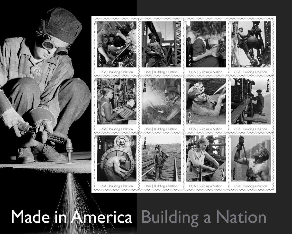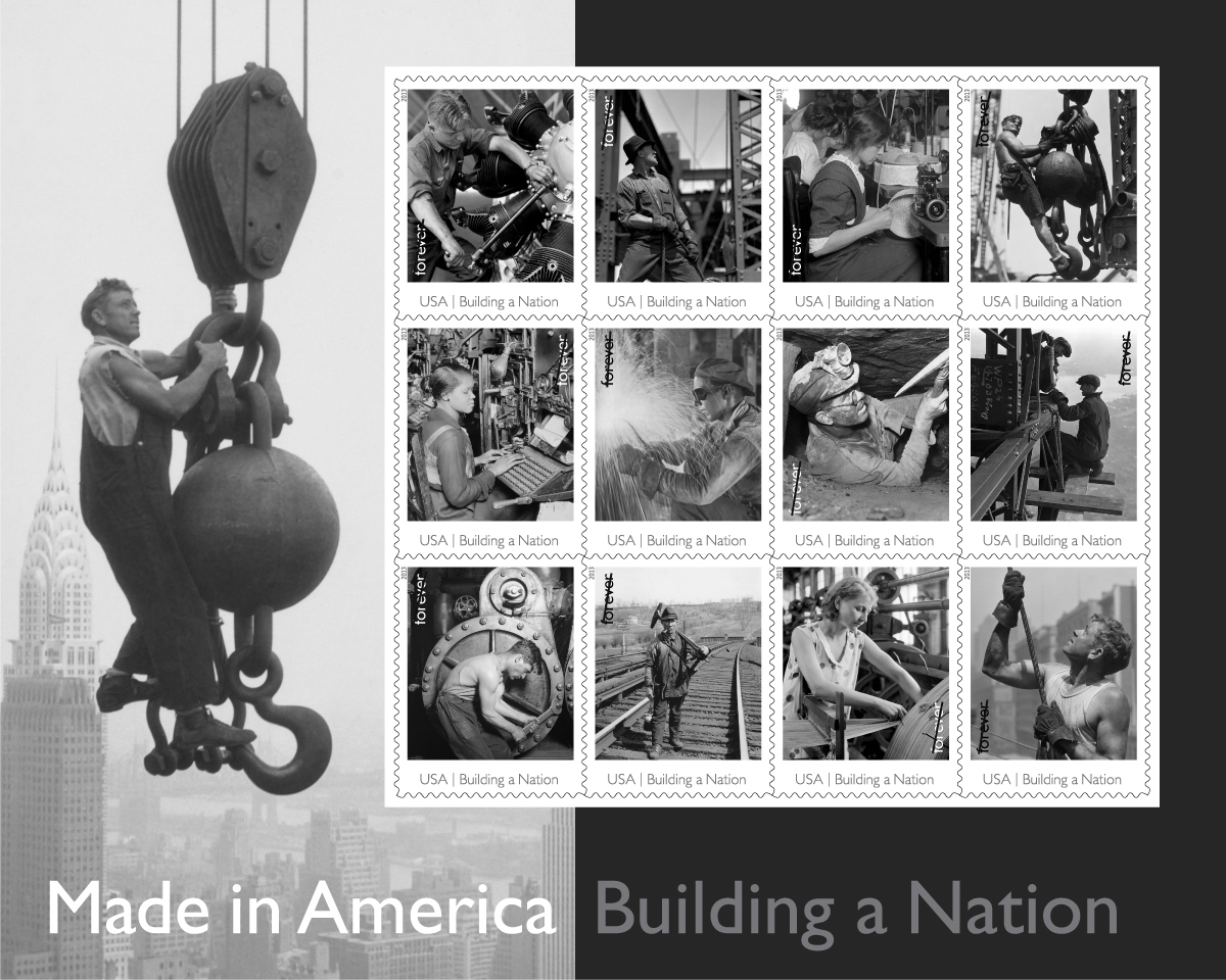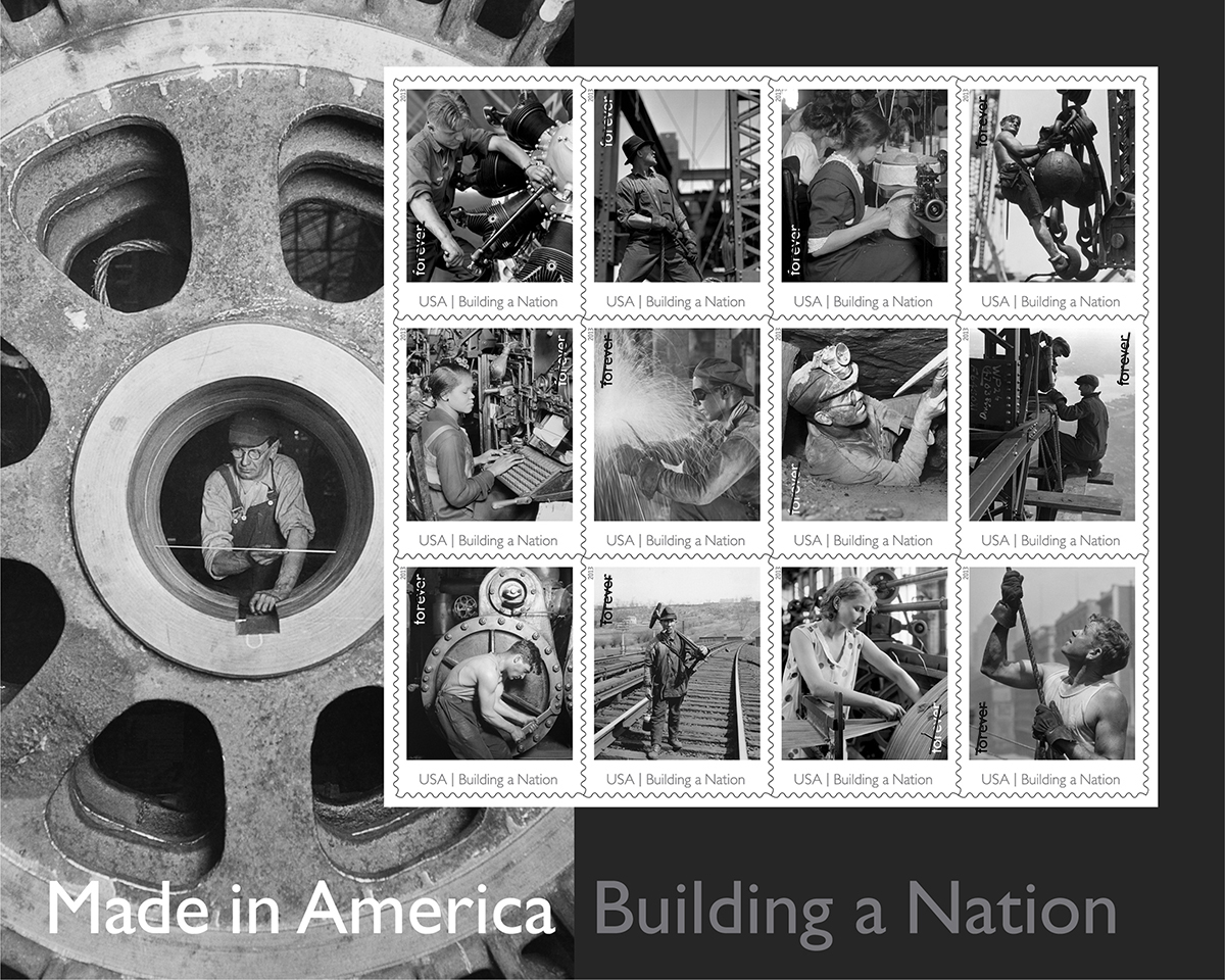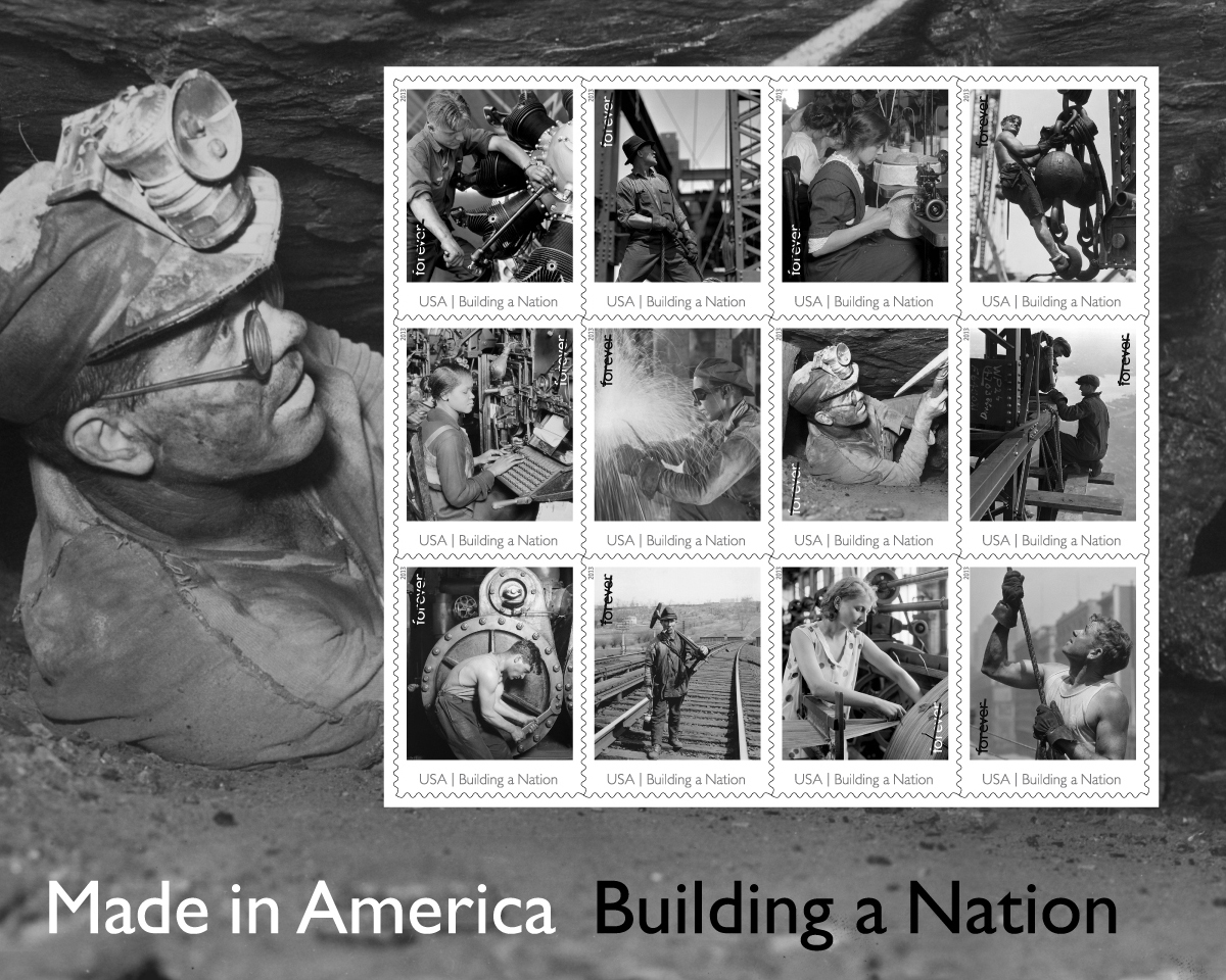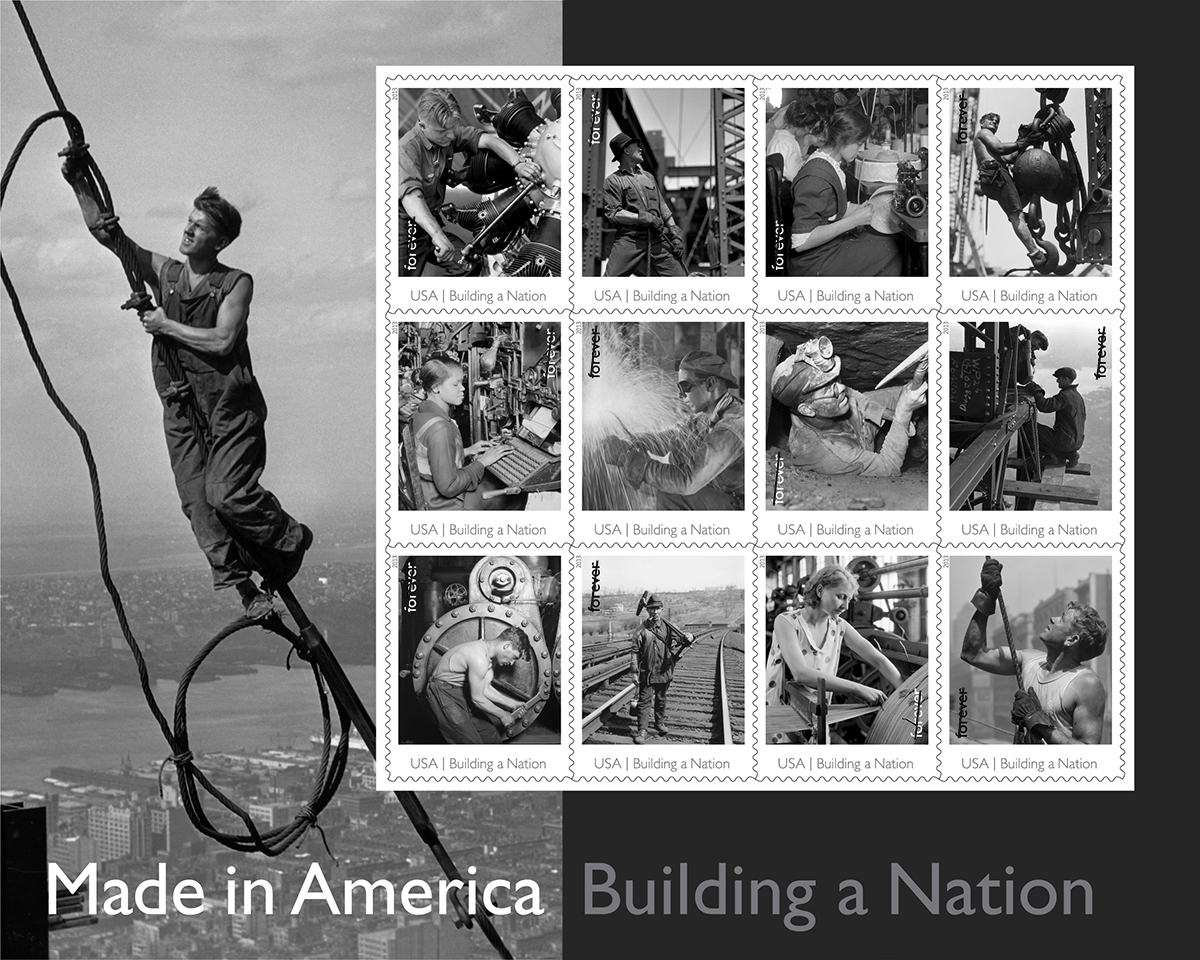 Made in America: Building a Nation [Click to see all 5 panes: “The Made in America: Building a Nation stamps honor the courageous workers who helped build the United States.” With those words, the Postal People announced an ambitious program offering 12 different stamps featured in five different pictorial margin panes. In the top row are an airplane maker, a derrick man on the Empire State Building, a millinery apprentice, and a man on a hoisting ball on the Empire State Building. In the middle row are a linotyper in a publishing house, a welder on the Empire State Building, a coal miner, and riveters on the Empire State Building. In the bottom row are a powerhouse mechanic, a railroad track walker, a textile worker, and a man guiding a beam on the Empire State Building. The five different sheets each have a different selvage photograph: two with Empire State Building iron workers, another with a General Electric worker measuring the bearings in a huge casting, the fourth uses the same image of the coal miner that appears in the stamp pane, and the final margin depicts a female welder. |