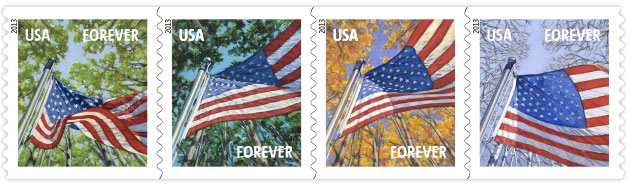 A Flag for All Seasons [Click to see 4 designs] The A Flag for All Seasons set of four stamps shows the American Flag at various times of the year, with each season indicated by the trees in the background. Federal law states that the American flag should be displayed every day of the year. As long as a flag is a durable, all-weather flag, it may be displayed outdoors throughout the year, regardless of the weather. See May 3, May 17, or August 16, for other A Flag for All Seasons 2013 issues. |