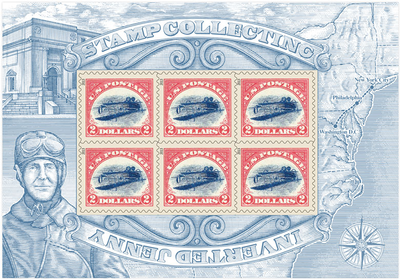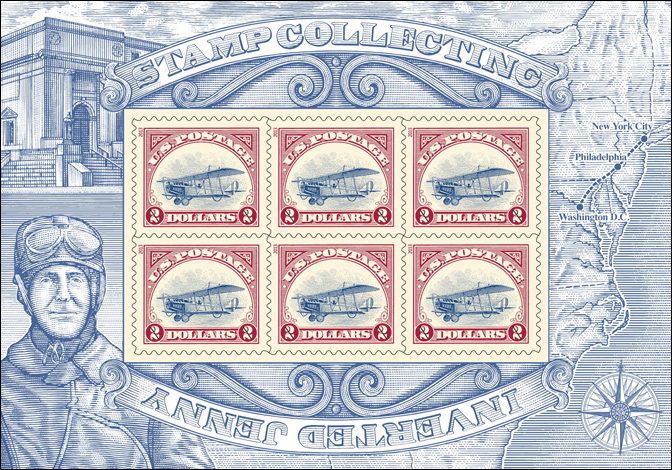 Inverted Jenny [Click to see sheet] This souvenir sheet features a new version of the world-famous Inverted Jenny error. The sheet includes six Inverted Jenny stamps, reprinted with an updated denomination and surrounded by an illustration that includes the National Postal Museum in Washington, D.C.; the route of the first regularly scheduled airmail service between Washington, Philadelphia, and New York; and aviation pioneer Reuben H. Fleet, who was in charge of the first group of airmail pilots. Originally issued on May 14, 1918, to commemorate the start of the first regular airmail service the following day, the stamp features a Curtiss JN-4H, or “Jenny,” the biplane used to deliver the mail. One sheet of 100 stamps that mistakenly showed the biplane upside down was sold on the first day of sale to a collector in Washington, D.C.—and one of the greatest philatelic treasures in U.S. history was released into the world. The new Inverted Jenny stamp is being reprinted with a $2 denomination to make it easily distinguishable from the 24-cent 1918 original. The souvenir sheet will be issued in conjunction with the opening of the William H. Gross Stamp Gallery at the National Postal Museum. |