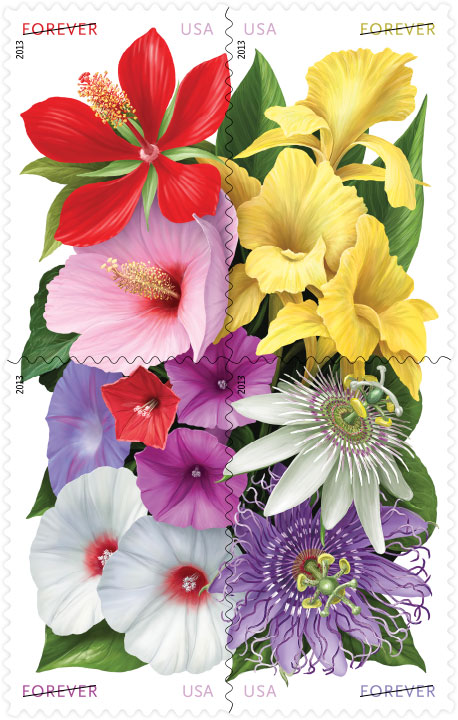 La Florida [Click to see 4 designs] This set of four stamps commemorates the 500th anniversary of the naming of Florida and celebrates the state's floral abundance. During the Easter season of 1513, Spanish explorers first visited the area and named it "La Florida" for Pascua Florida ("Feast of the Flowers"), Spain's Easter celebration, and for the verdant display of vegetation that they could see from their ship. Each stamp shows a particular variety of flower: red and pink hibiscus; yellow cannas; morning glories in white, red, and shades of purple; and white and purple passionflowers. The stamp pane, whose photo has not yet been released, includes on the selvage an imagined scene of explorers traveling in a small boat along a river or channel surrounded by tropical foliage.