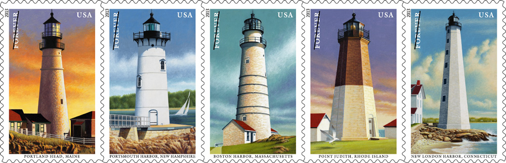 New England Coastal Lighthouses [Click to see 5 designs] Capitalizing on one of its more popular themes, in 2013 the U.S. Postal Service will add New England Coastal Lighthouses to its previous Lighthouses issues. The new set features the lighthouses at Portland Head, Maine; Portsmouth Harbor, New Hampshire; Point Judith, Rhode Island; New London Harbor, Connecticut; and Boston Harbor, Massachusetts. These five lighthouses are among the oldest in the U.S., and each is on the Click here for USPS Provides Lighthouses Details [PDF Document] |