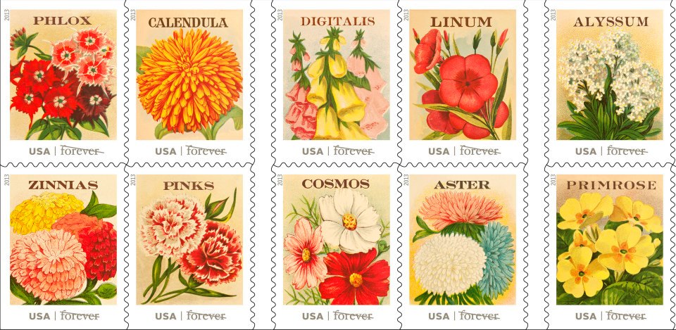 Vintage Seed Packets [Click to see sheet] Flowers being among the most popular subjects on stamps, the USPS offers a new take on the subject with Vintage Seed Packets. From hand-tinted lithographs in the early 1800s to modern photography, images of beautiful flowers have adorned seed packets for more than a hundred years. The stamp art for this issue features ten photographs of antique seed packets, printed between 1910 to 1920, cropped to focus on these flowers: cosmos, digitalis, pinks, primrose, calendula, aster, linum, alyssum, phlox, and zinnia. Above each illustration in bold capital letters is the name of the flower depicted. |